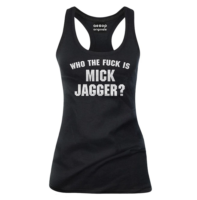 This women’s rocker tank top is made of cotton. It is slim-fitting and has a deep U-neck. It comes in black with white WHO THE FUCK IS MICK JAGGER? letter print on the front. You can pair this top with skinny pants, leggings or pencil skirts.