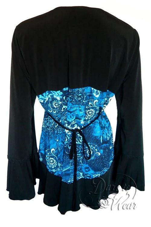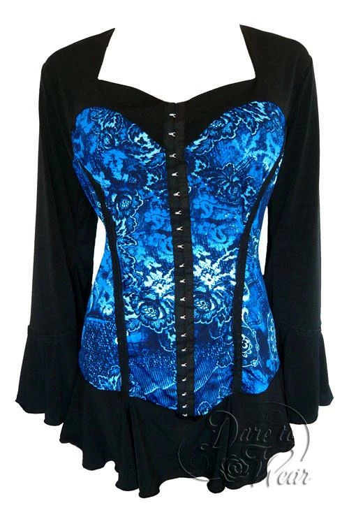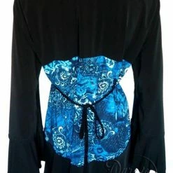 Everyone loves the corset look – it cinches down your waist and gives more va-voom to your curves. The problem is that a corset is not very comfortable. In Victorian times, they would pull them so tight that ladies would get light-headed and faint. We’ve solved the problem with our new Corsetta top! It’s a blouse that is styled like a corset over a blouse. The corset “look” is created by faux hook-and-eye closures and black lace princess seams over bold printed panels. This is a corset that won’t make you faint, but it’s not for the faint of heart!