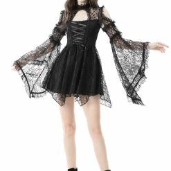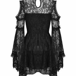 Black dress with long bell sleeves, cold shoulder design and floral lace all over.