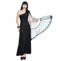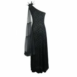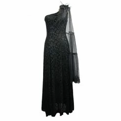 Can you imagine how sexy you will look in this Gothic dress made of polyester and chemical fiber? It is one shoulder with a floral embroidery long flare mesh attached creating a cloak sleeve. The dress comes in a solid color and is jacquard. This dress contains real feather ornaments for a more feminine feel. It is slim fitting from the shoulder to the waist from where it is made flare down the ankle. You can pair it with stilettos or strappy heels.