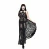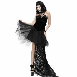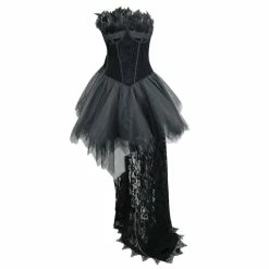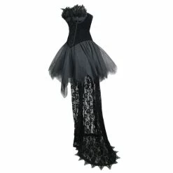 This sexy Gothic black sleeveless mini dress is made of polyamide. The top is made of a corset with feather details on the bust caps and back lacing to adjust the fitness. It is also jacquard below the chest area and made fitting to the waistline. The skirt is made of a layered pleated mesh that makes it flare. It also has a floral embroidery lace patchwork extending from one side down to sweeping the floor. You can pair this dress with stilettos or platforms to step out.