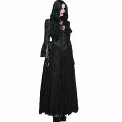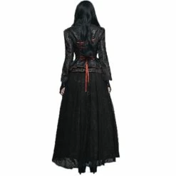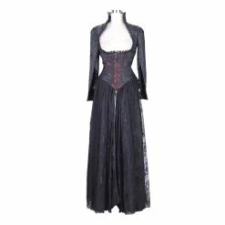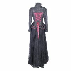 This all lace dress has split design long sleeves and a peplum top with a front zipper. It features a scoop neckline design with red ribbon trimmings loops at the back to ensure a perfect fit. It has an ankle-length ball gown skirt.