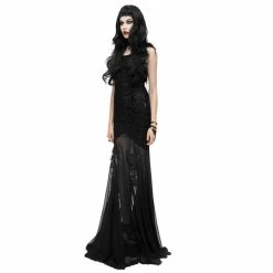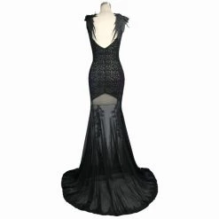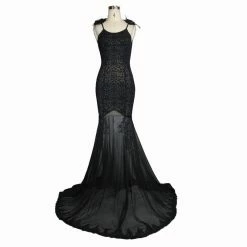 Imagine how sexy you’d look in this Gothic dress made of cotton and spandex. It has a U-neck and an open back with wing and feather details. The jacquard bodice is slim fitting to the hips from where a floral embroidered mesh is patched to create a mermaid tail. The dress comes in a solid color, is super long and contains real feather ornaments for a classy feel. Pair it with stilettos for a date or dinner.