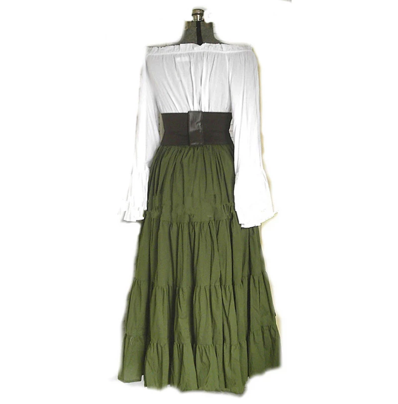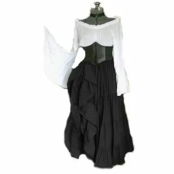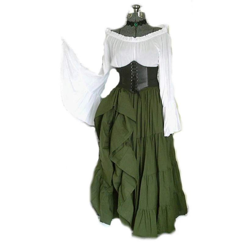 This dress is made of polyester material and is available in six variations to choose from. It has an off-shoulder neckline that is ruffled all round. This dress has long flared sleeves and a corset with a front lace-up closure. It also has an asymmetric hemline that ends below the waist on the right side side giving it a side split appearance. It features a pleated design and is long to the ankle at the front, back, and left side. It is suitable for Halloween or cosplay events.