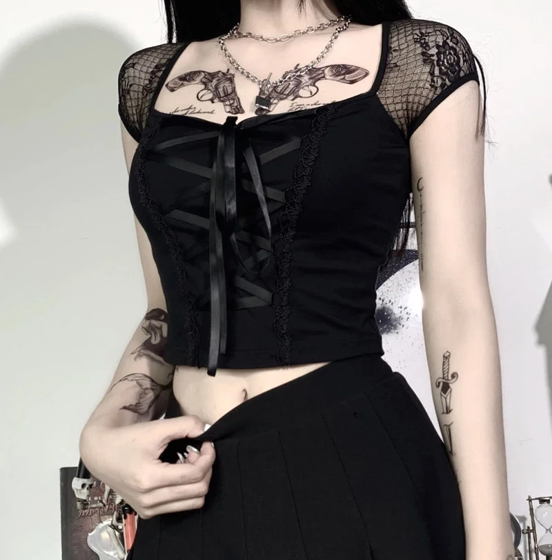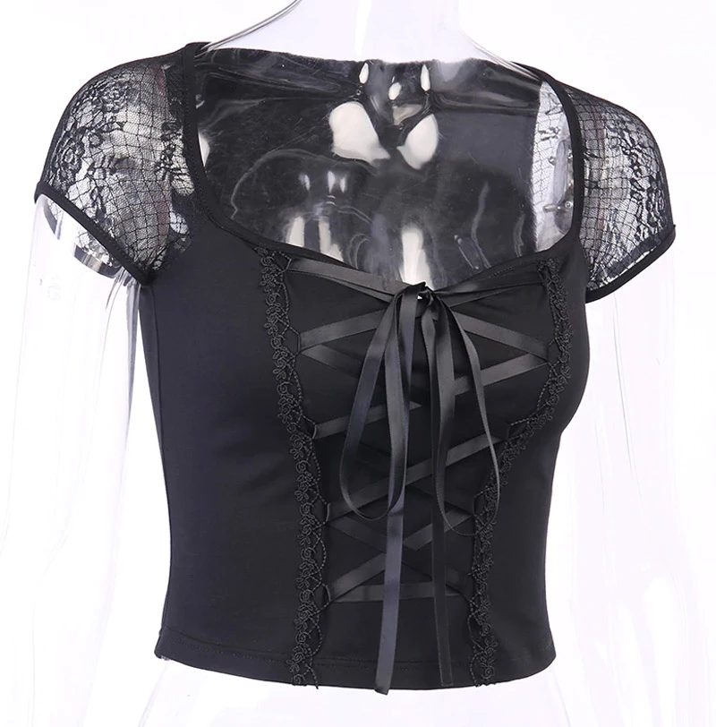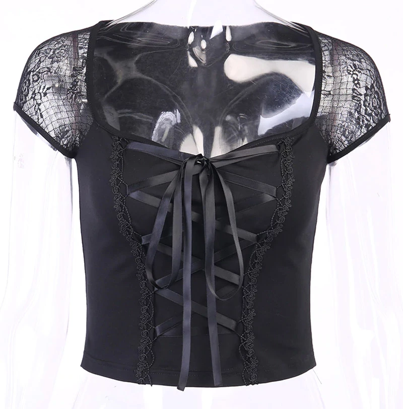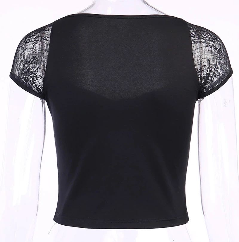 This women’s black short-sleeved top is made of cotton and polyester. It has hollow-out mesh sleeves and a sweetheart neckline. The front features lace and embroidery decoration. You can pair this top with a booty short and knee-high boots.