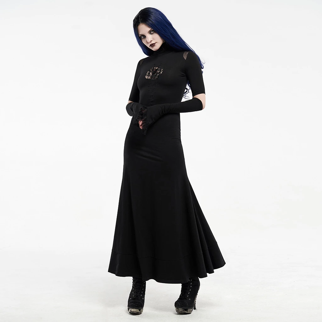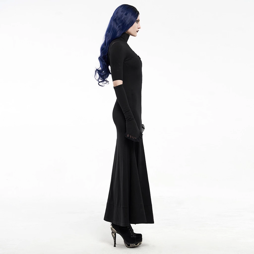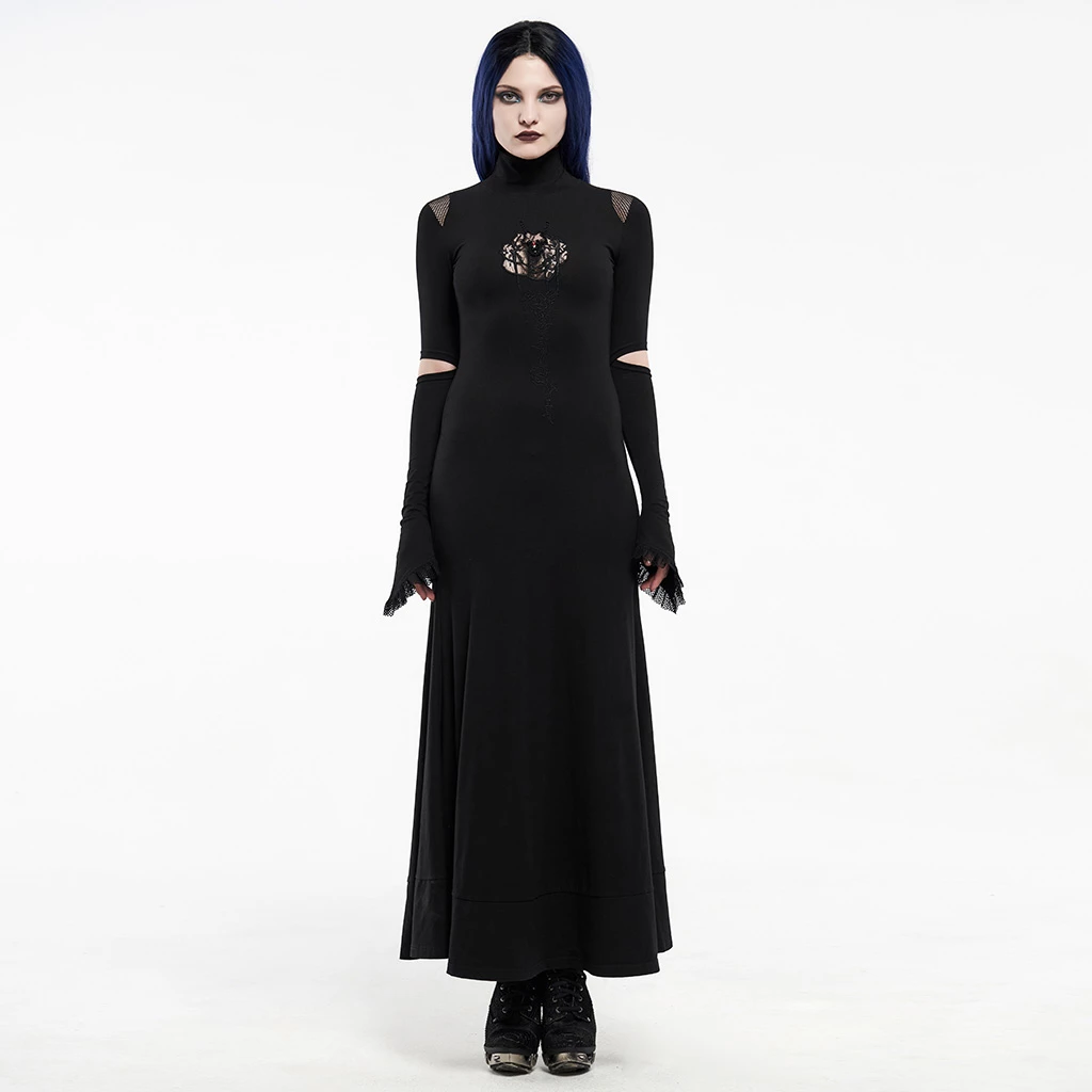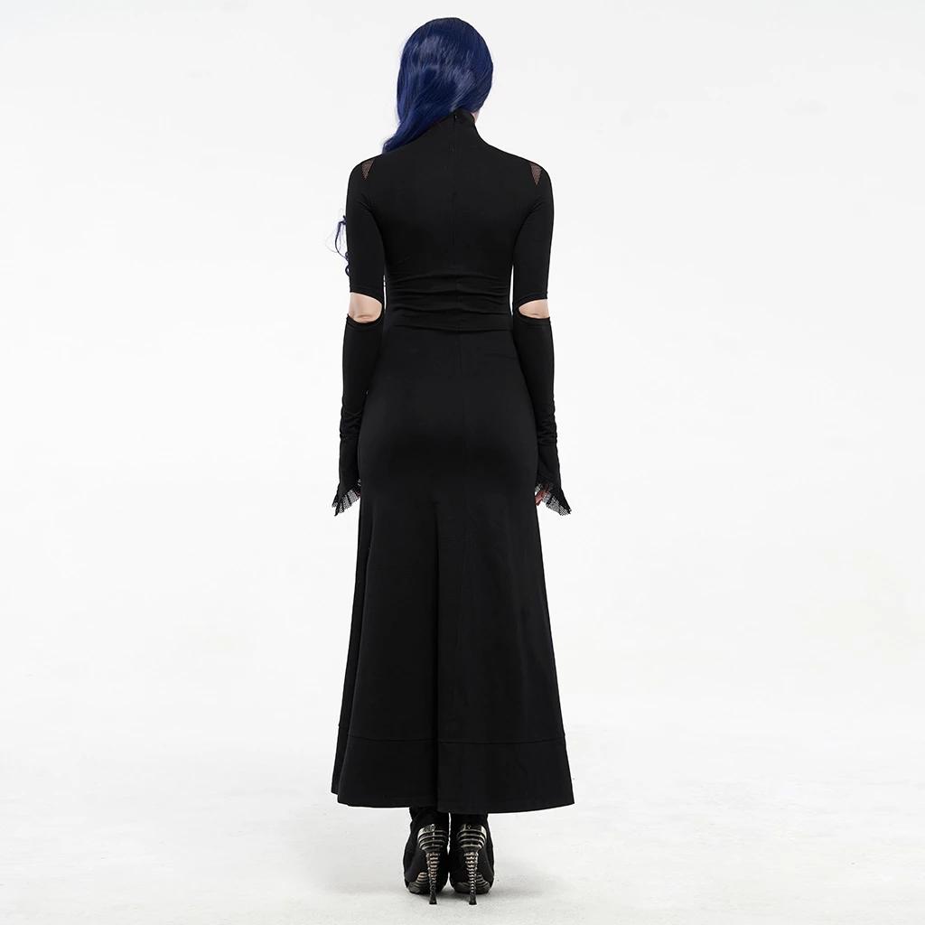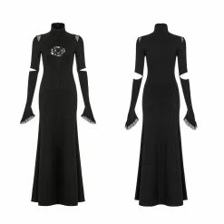 This black long-sleeved dress is made of cotton, spandex, and polyamide. It is long to the ankle and has flared sleeves with a stand collar. The dress is also pleated and features a hollow-out design on the chest, shoulders, and sleeves. You can pair this dress with heels and complete the look with a classy purse.
