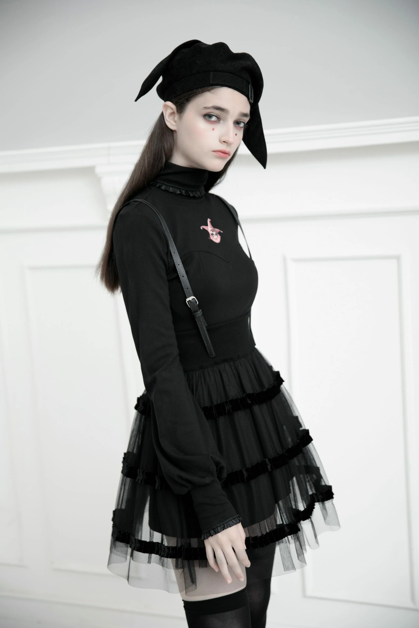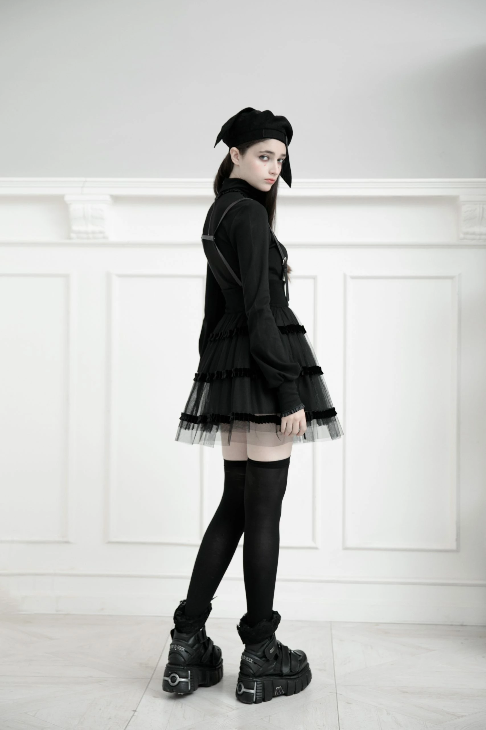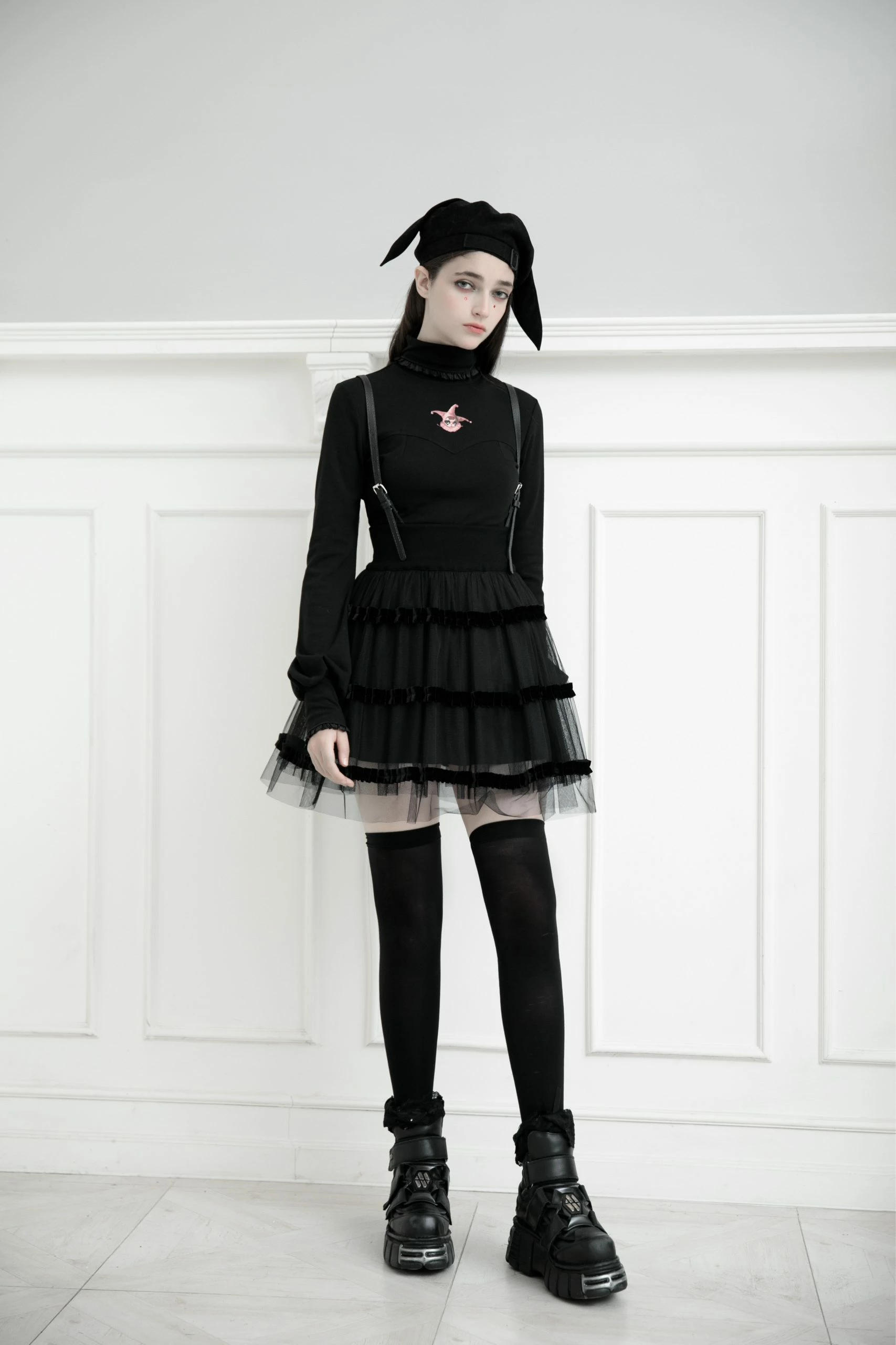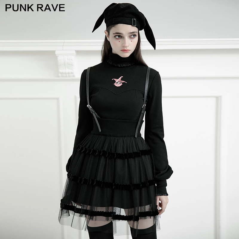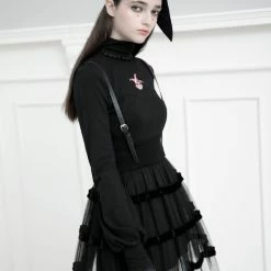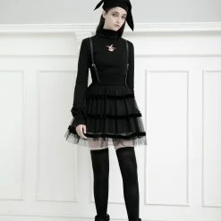 This gorgeous black dress is made of polyester, spandex, polyamide, and 100% acrylic fiber. The fabric used is soft to the skin making it comfortable to wear. It is a mini with adjustable and removable PU Leather shoulder straps. It also has a high waist that is double layered and has good elasticity. The bottom part of this suspender dress is detailed with hard mesh layering and ruffle detail giving it a fun look. This dress is perfect to wear with a white or black t-shirt and finish the ensemble with cool white sneakers.