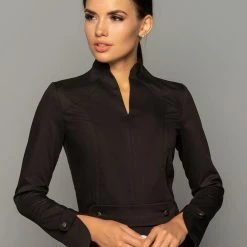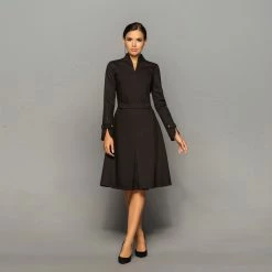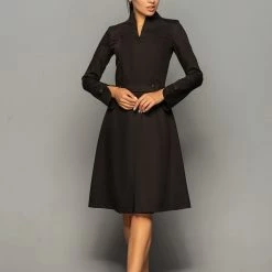 A beautiful structured dress featuring high neck collar, a-line silhouette, and long sleeves.
