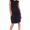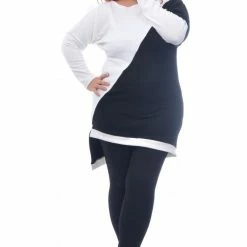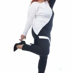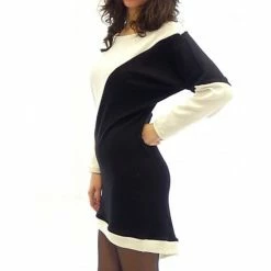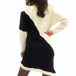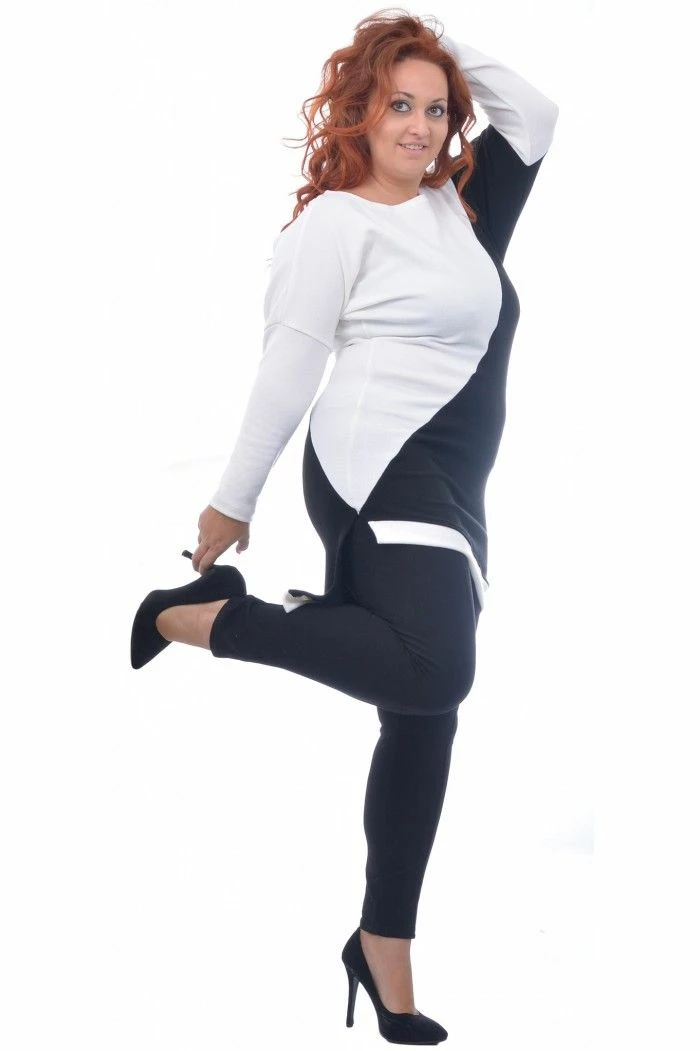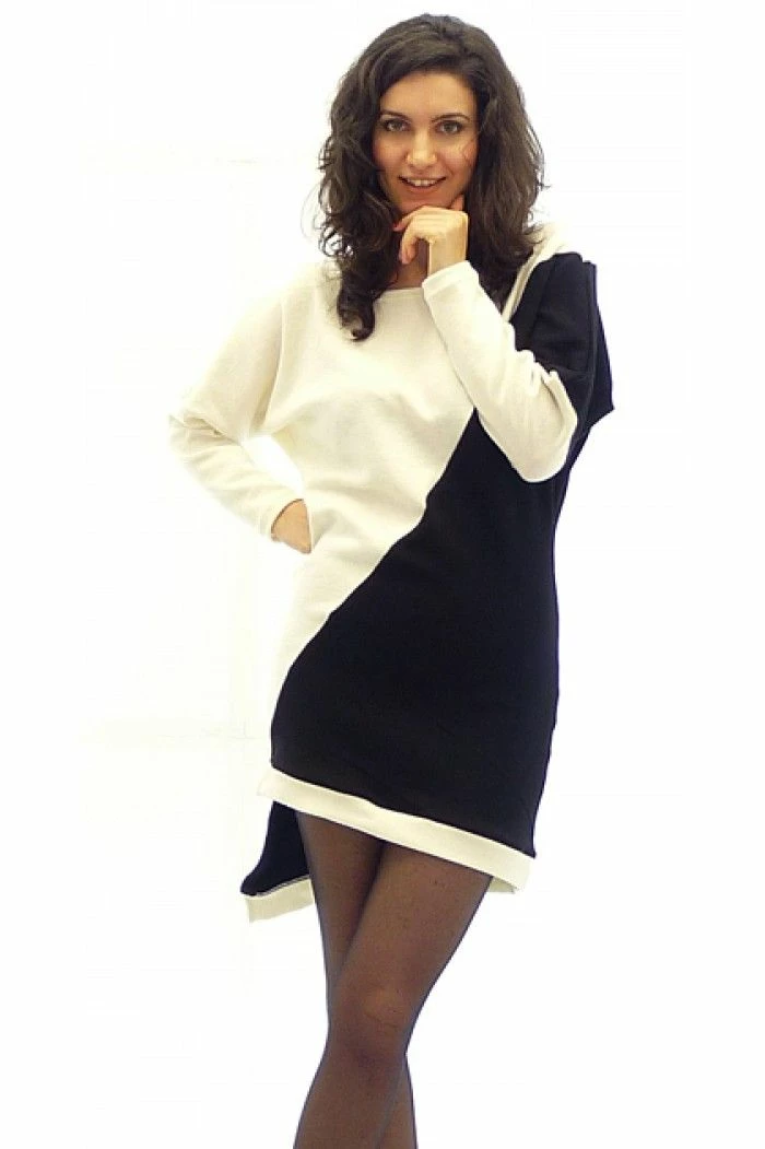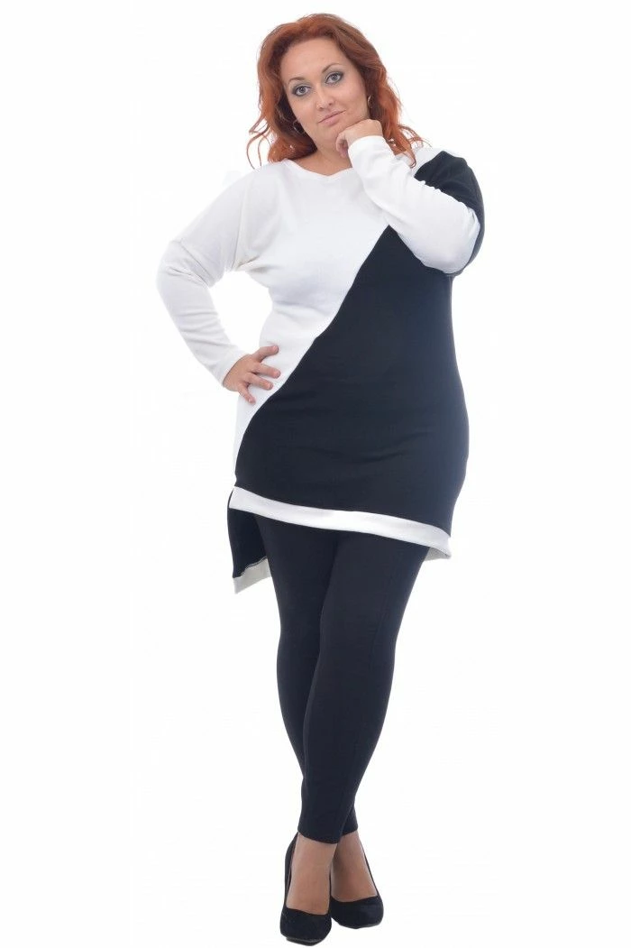 Asymmetrical knitted tunic in black and white. On the front the tunic is long to under the hip. The back of the model is longer and is cut in a triangle shape. The sleeves of the tunic are with manchets to above the elbows.