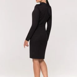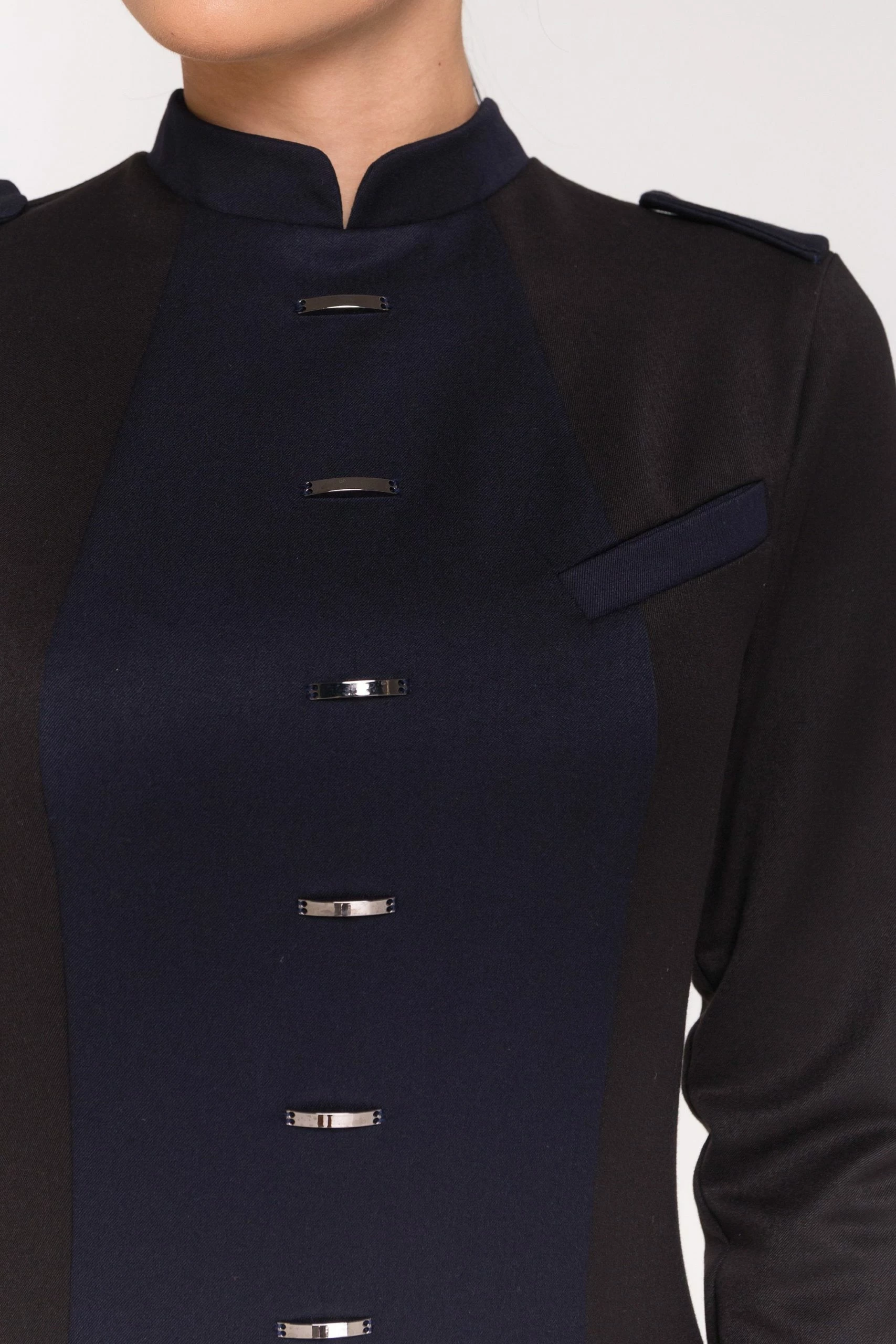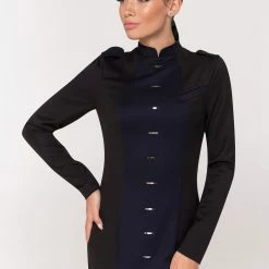 A stylish midi dress faturing high neck collar, military style, and long sleeves.