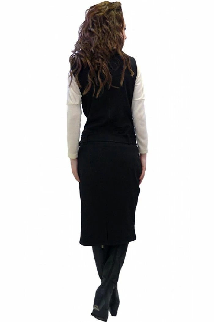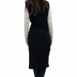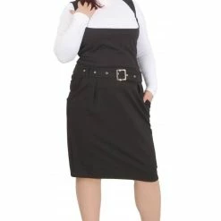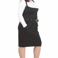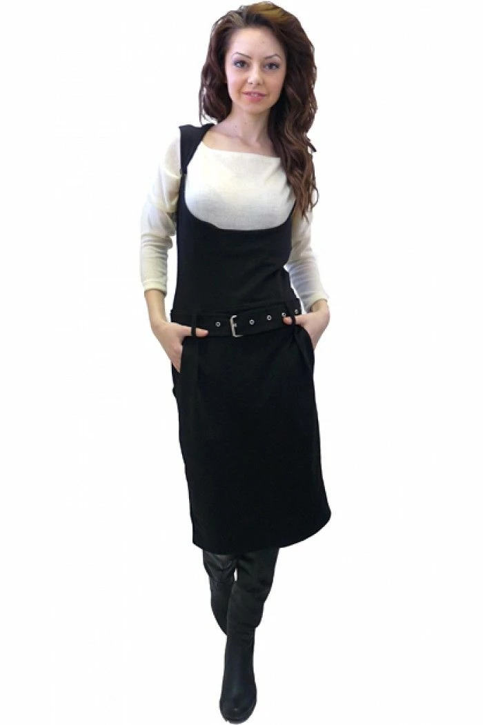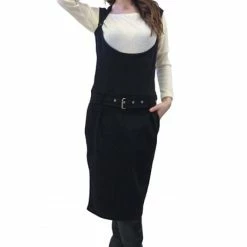 Black pinafore with round cleavage under the bust. The pinafore comes with a jersey belt. The model has two pockets.Â