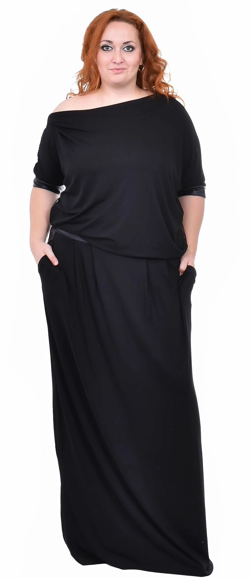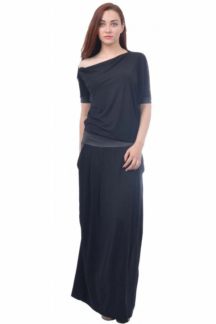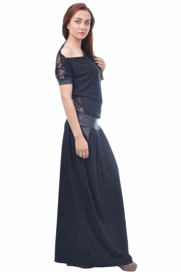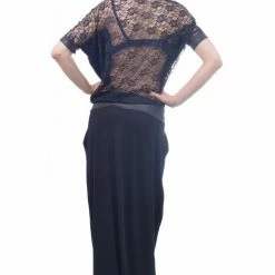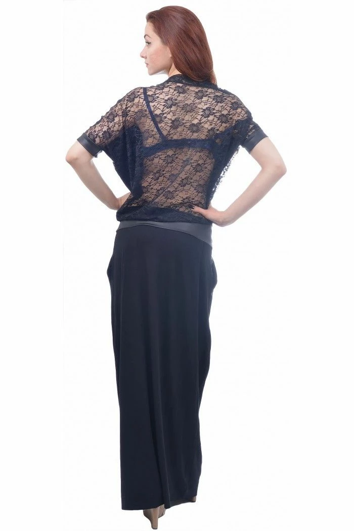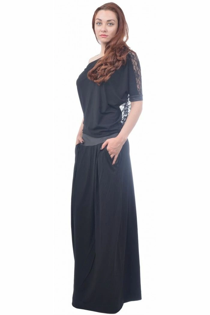 Long black dress with low waist and pockets. The dress is with lace back and lace cants on the sleeves.