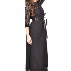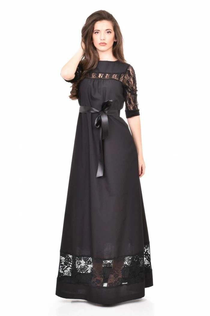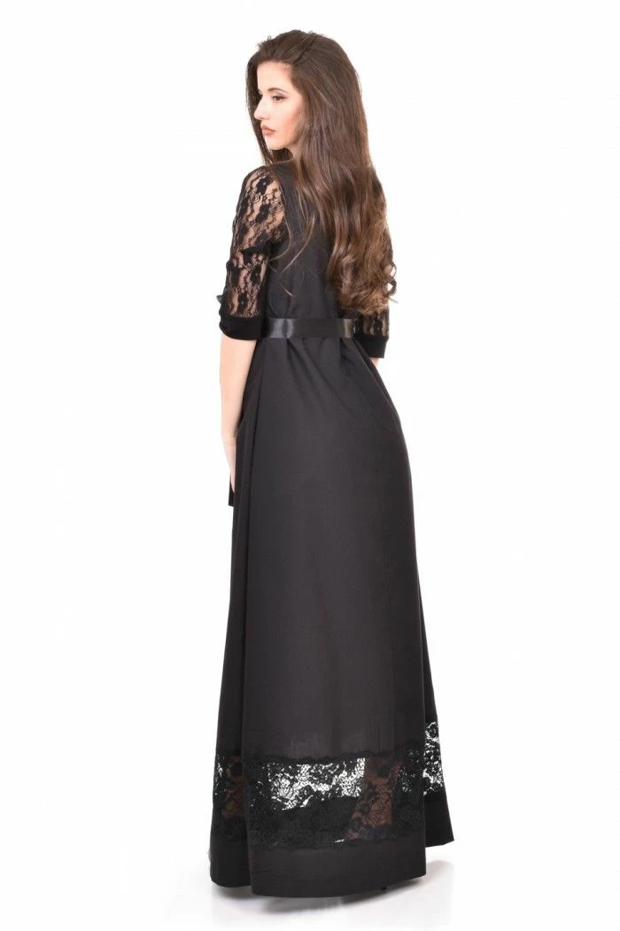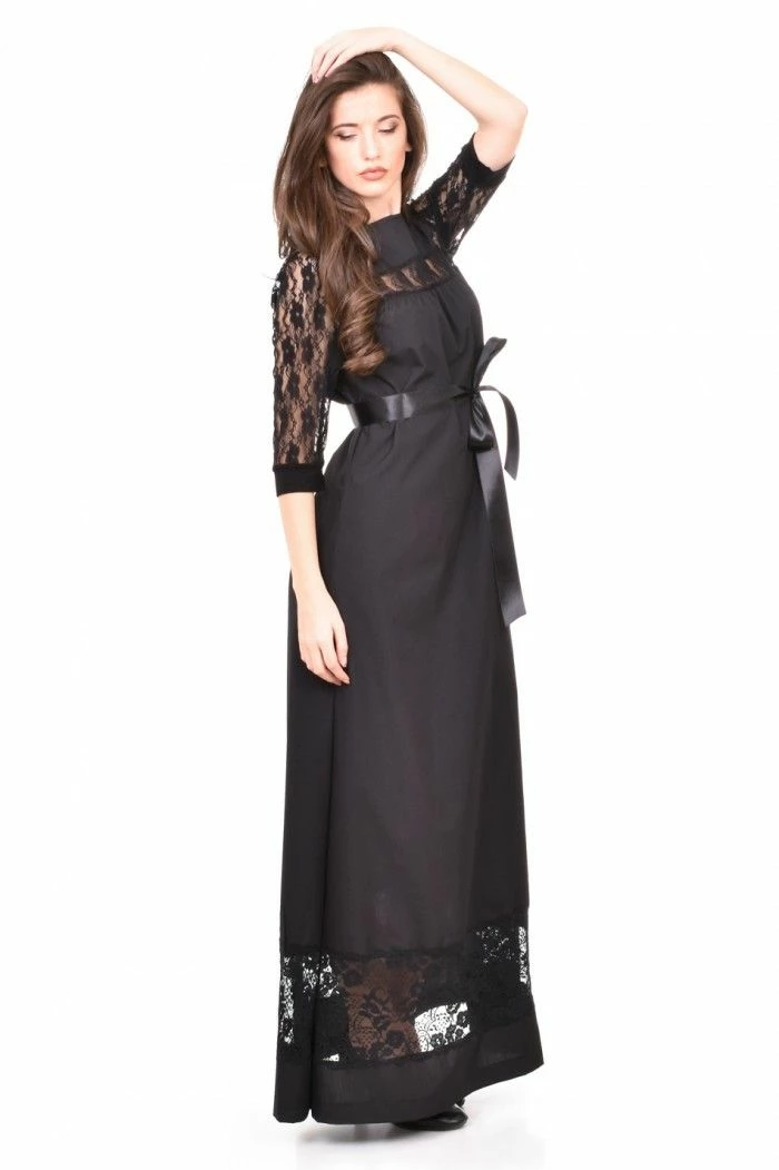 Elegant long dress in black. The model is with loose fit cut and features beautiful lace sleeves and elements as well as satin belt which flatters the waist. The dress is very stylish, suitable for a special occasion.Â