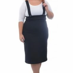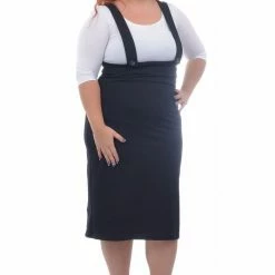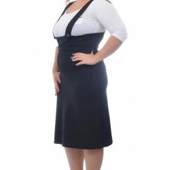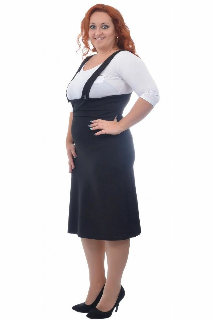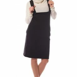 Black pinafore with knee-length. The pinafore is with crossed on the back straps.Â