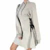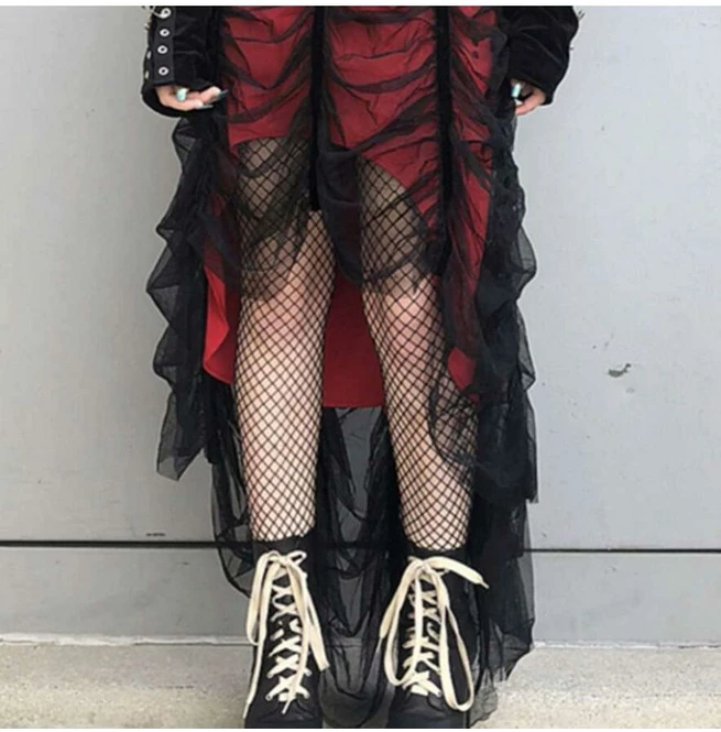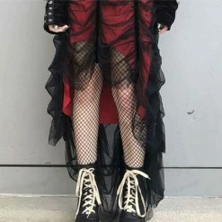 It is detailed with mesh and a pleated ruched design for a Goth look.