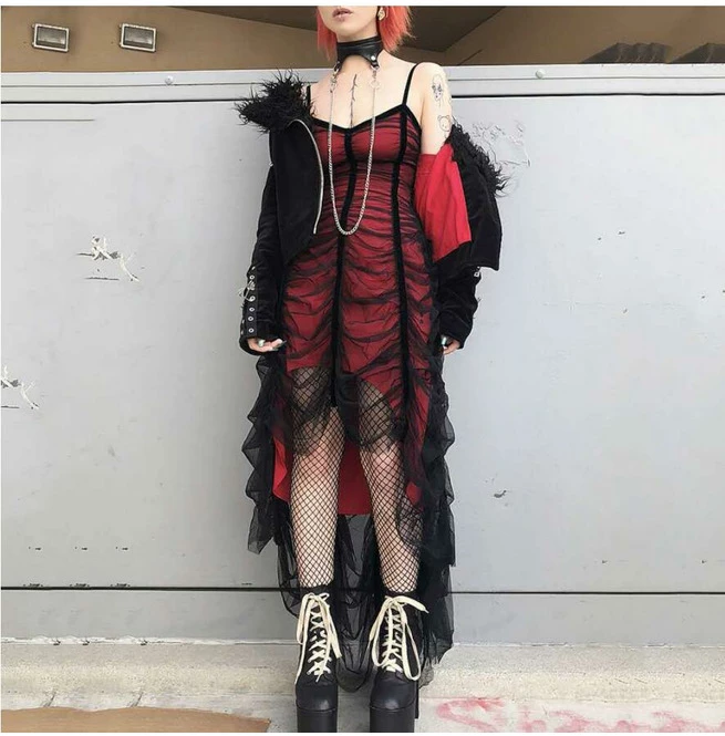 Black red Goth dress with adjustable shoulder straps and an asymmetrical hemline.