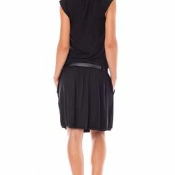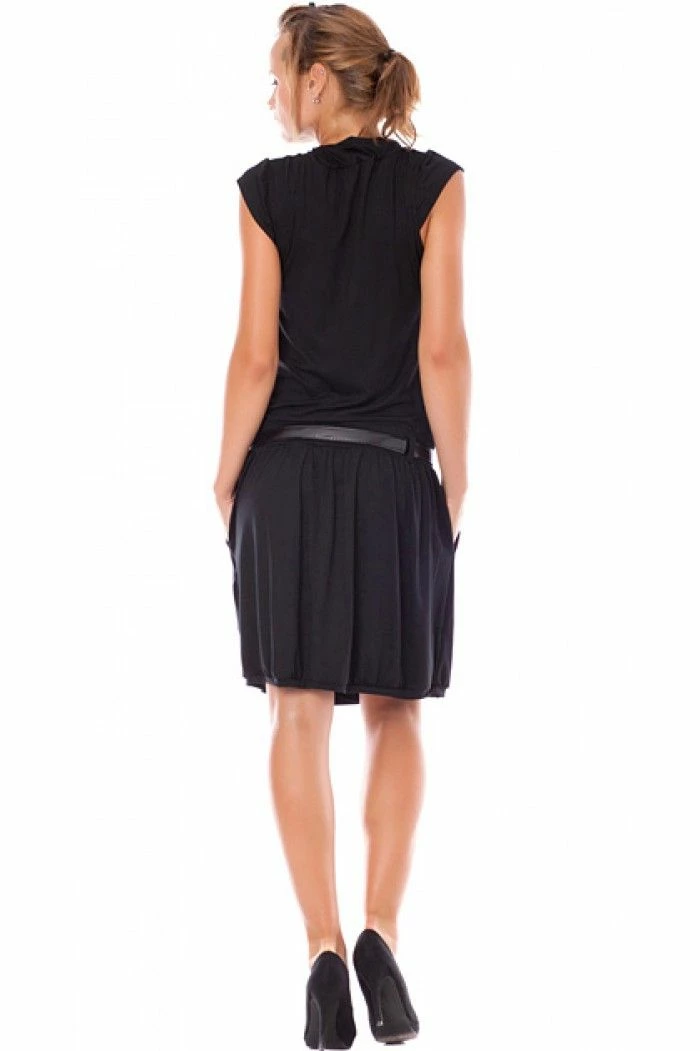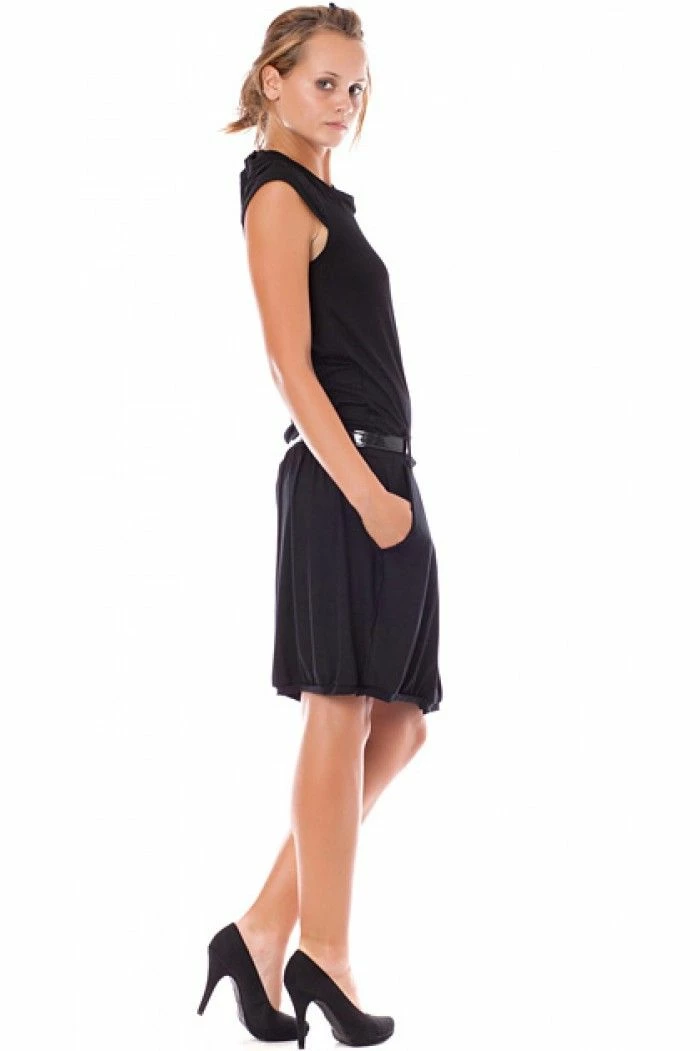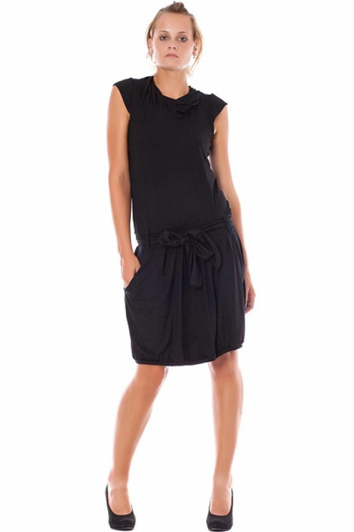 Black dress with short sleeves. The dress comes with a jersey belt.Â