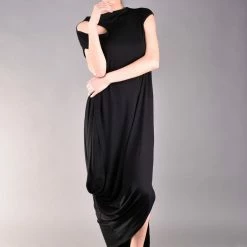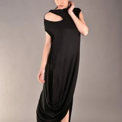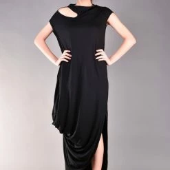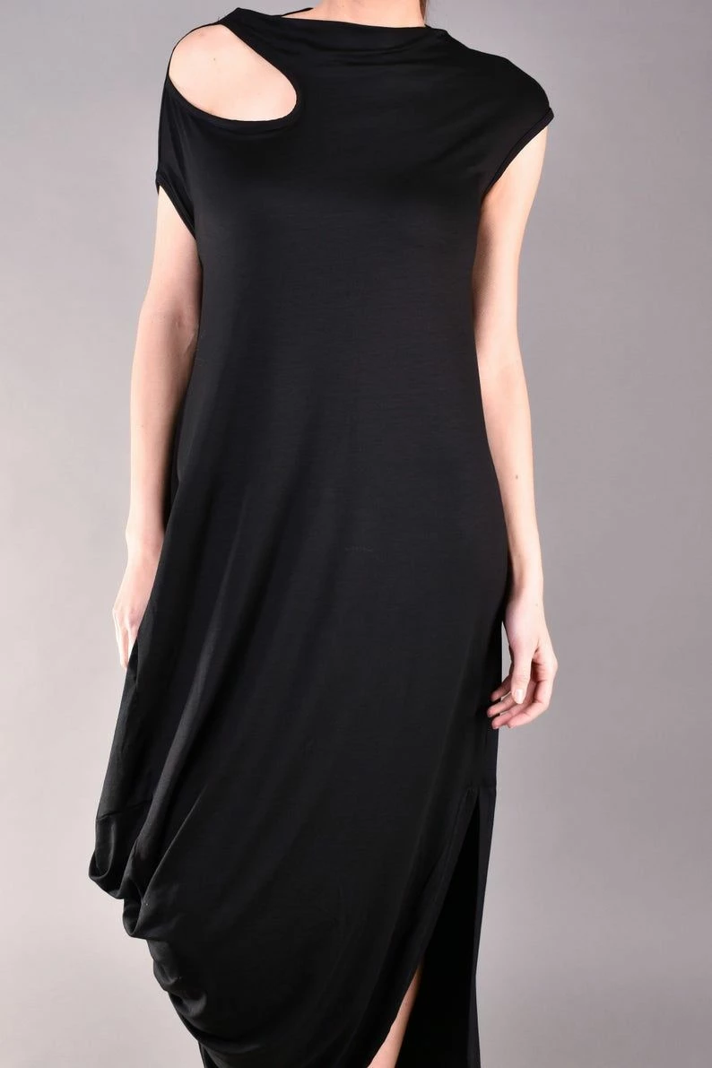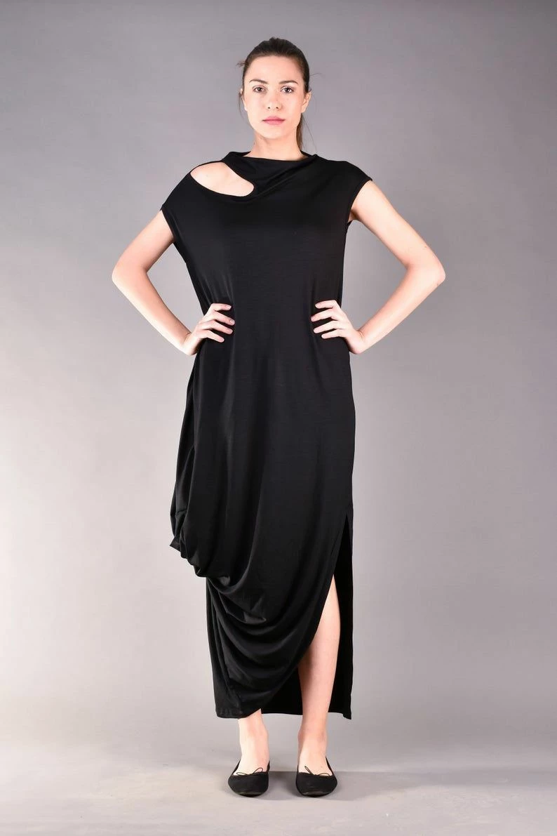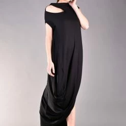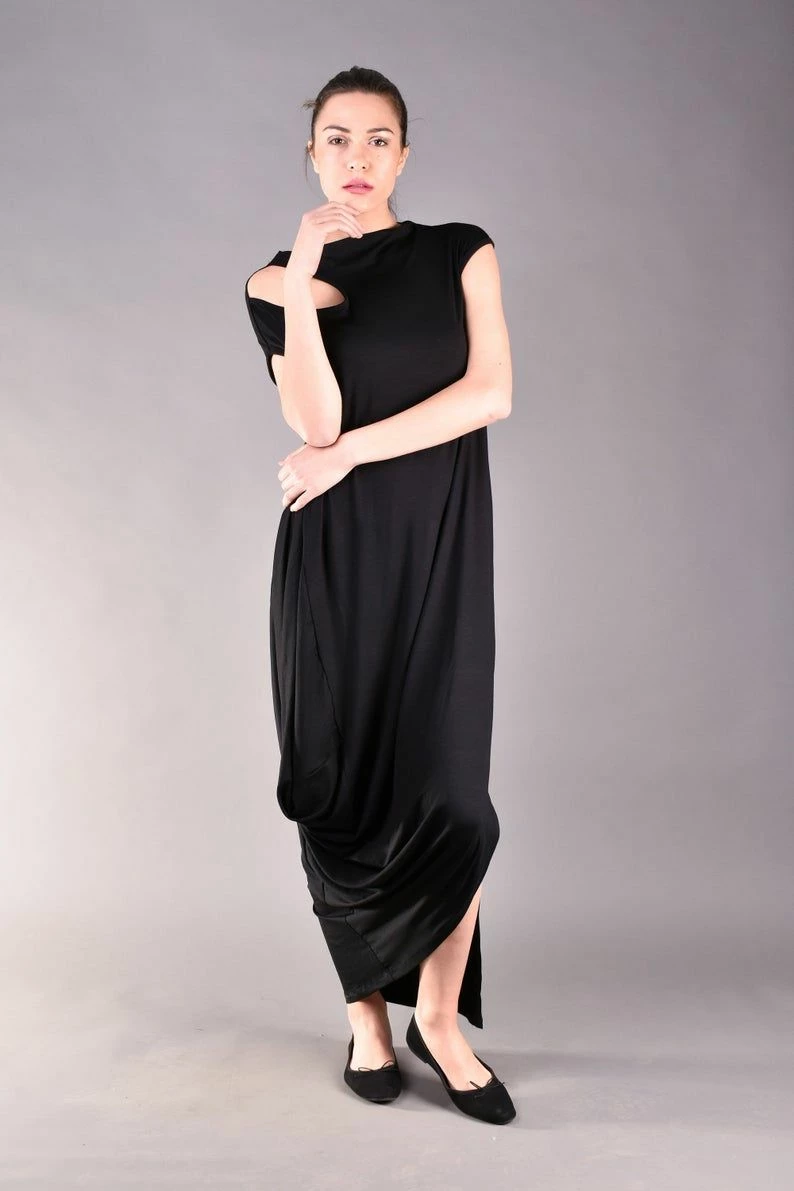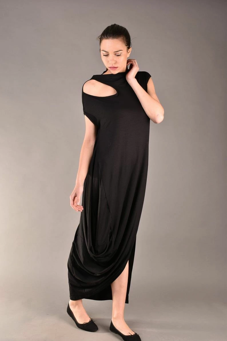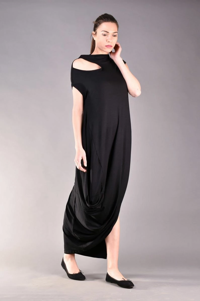 Gorgeous short sleeve dress in black. Every woman knows the power of the long black dress, but this one is definitely a must have for your wardrobe. The cut out shoulder and the draped cut make the design stylish and classy but comfortable as well. The best part is that this maxi dress can be worn for different occasions such as a night party or just a casual walk.