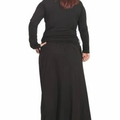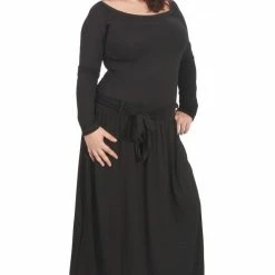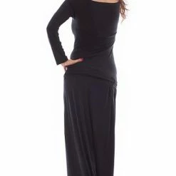 Black jersey dress. The dress comes with a jersey belt in the same color. The model is with long sleeves.Â
