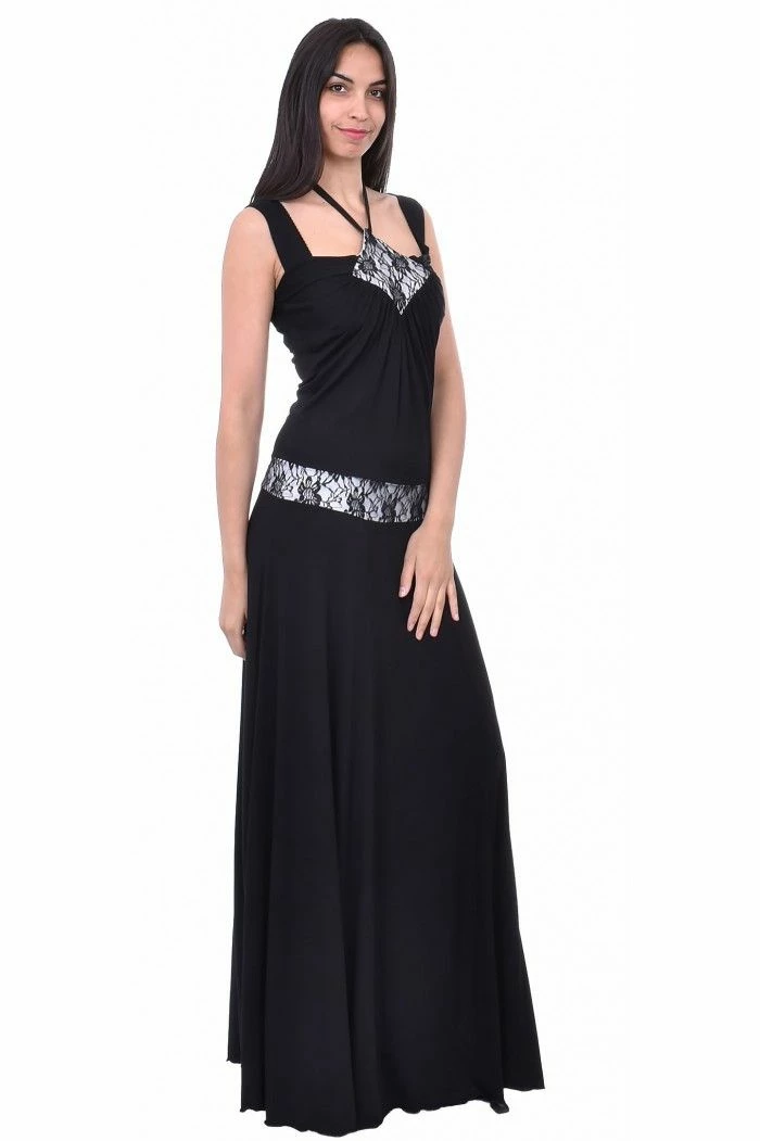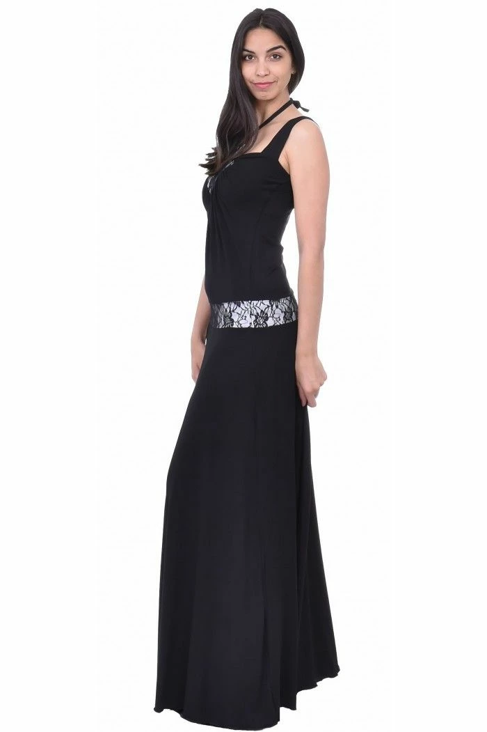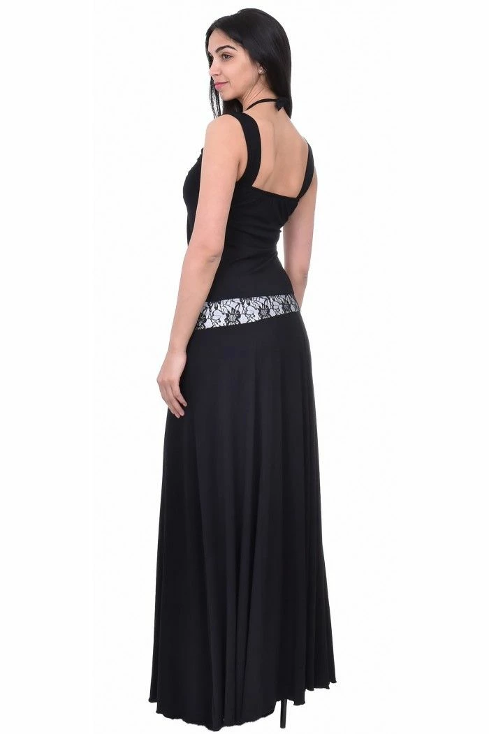 Long flared dress with straps. The dress is made of jersey fabric. The model is with lower waist. The dress has a tie through the neck.