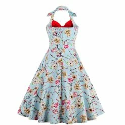 This vintage dress is made from cotton and polyester material. It comes in four different colors and sizes, giving you a wide option to choose from. The dress has a halter neck design and a bow at the front and fits to the knee. It has floral dresses making the dress have a fun look. It be paired with black or nude heels for a garden party or wedding.Â
