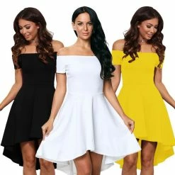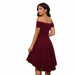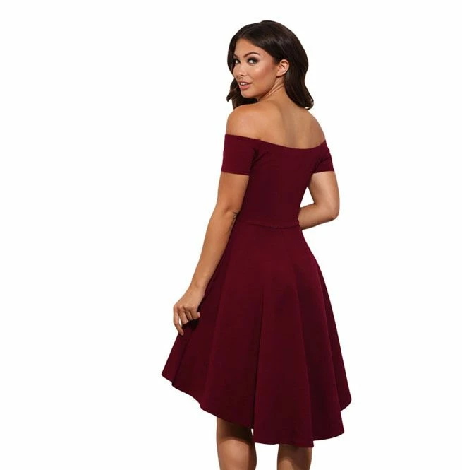 This sexy preppy style short-sleeved mini dress is made of spandex and polyester. It is off-shoulder with a slash neck. It is form-fitting from the neckline to the waist where it is pleated to make the skirt flare. The dress has a dovetail hem which makes it stand out. It comes in solid colors; therefore, you can pair with any color shoes and easy to accessorize. You can pair this dress with strappy heels, platform heels for prom, valentine’s date, dinner date, runway garden event, or lunch out.