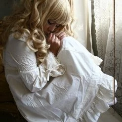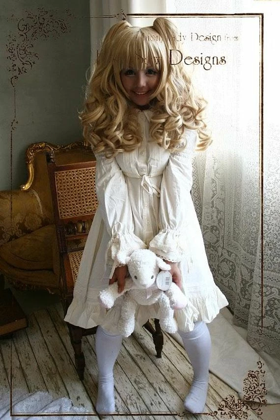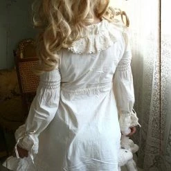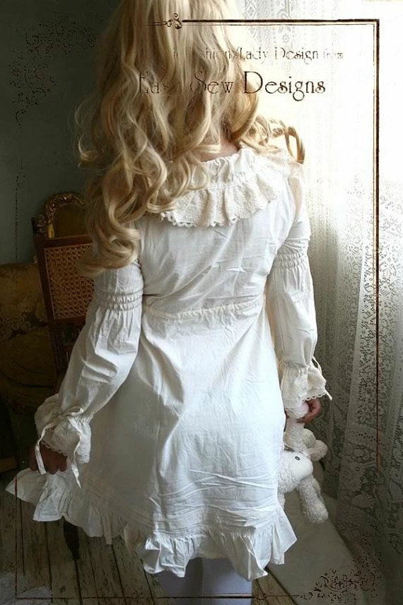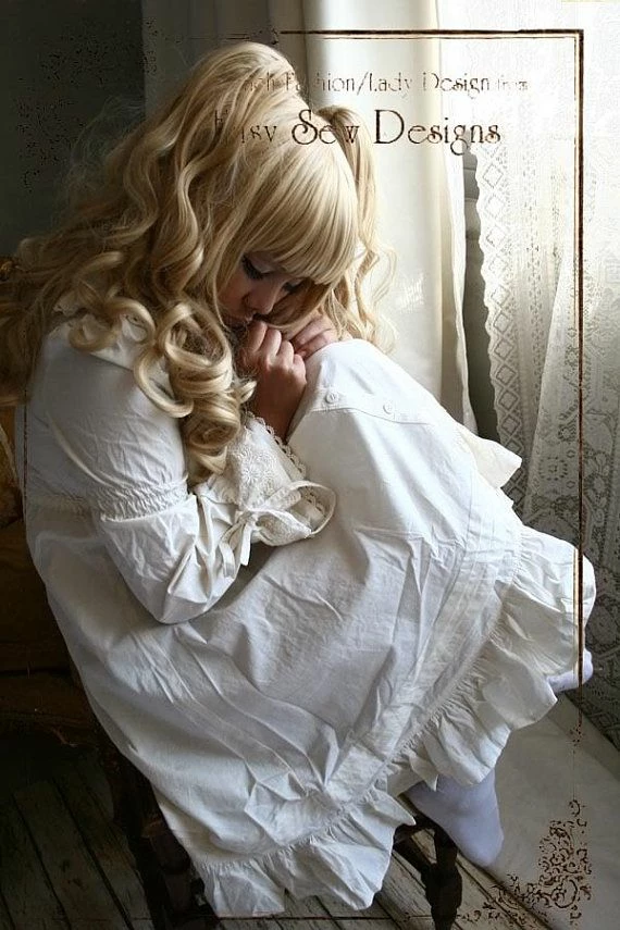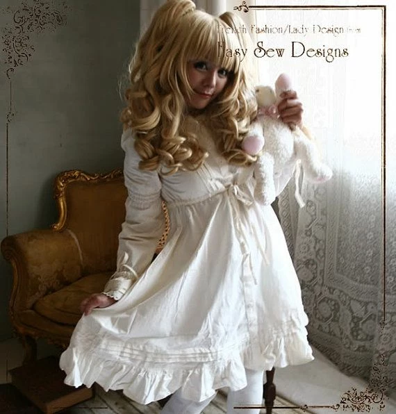 lovely sweet dream lolita button down babydoll dress. you can wear the dress as pajamas or as going-out dress. empire waist with drawstrings. pleated above waist line. skirt flared generously below waist line with horizontal pleates and frilly hem. frilly gathered collar with exquisite scalloped lace trim. sleeves is ruched around upper mid-arm. bell-shapped drawstring cuffs also have matching lace detail.Â