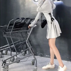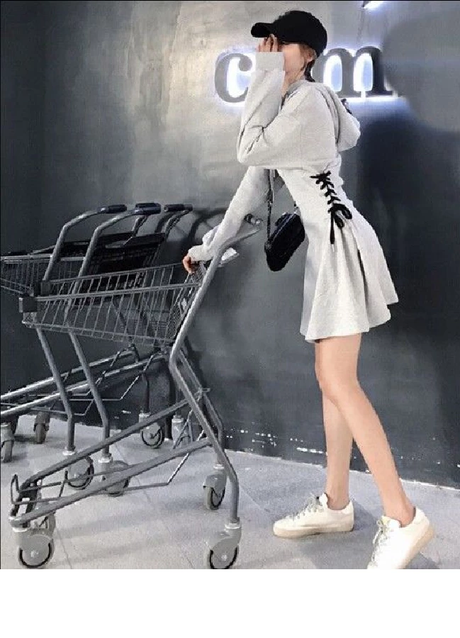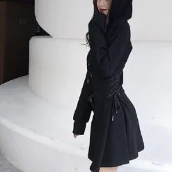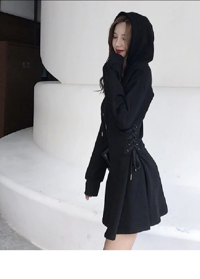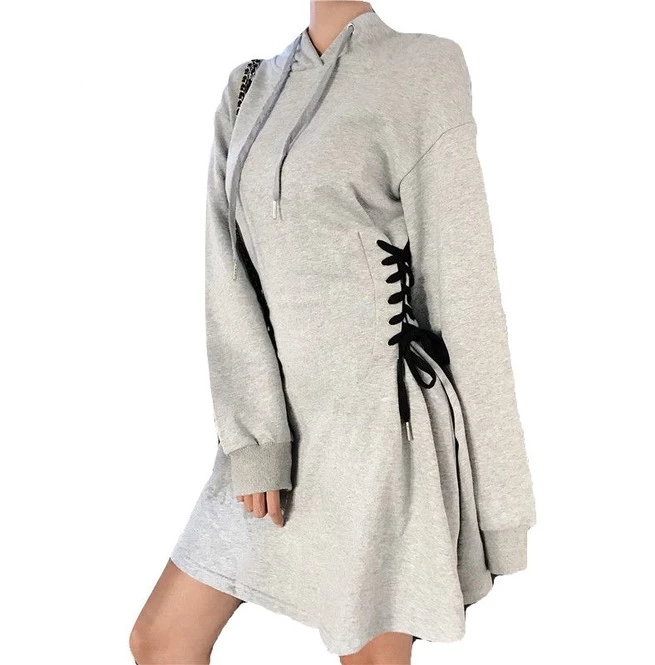 A one size long sleeve hooded dress with a side black lace-up for a cinched waist.
