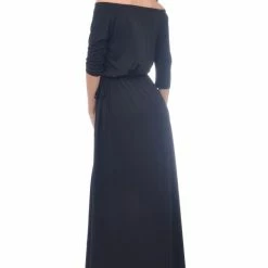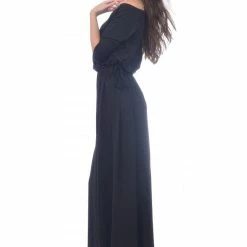 Long black dress with bare shoulders. The dress is with elastic waist. The model is with flared skirt. The dress is made of jersey fabric. Color: black; Material: 90% Viscose, 10% Elastane;