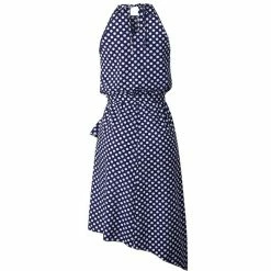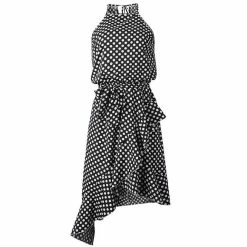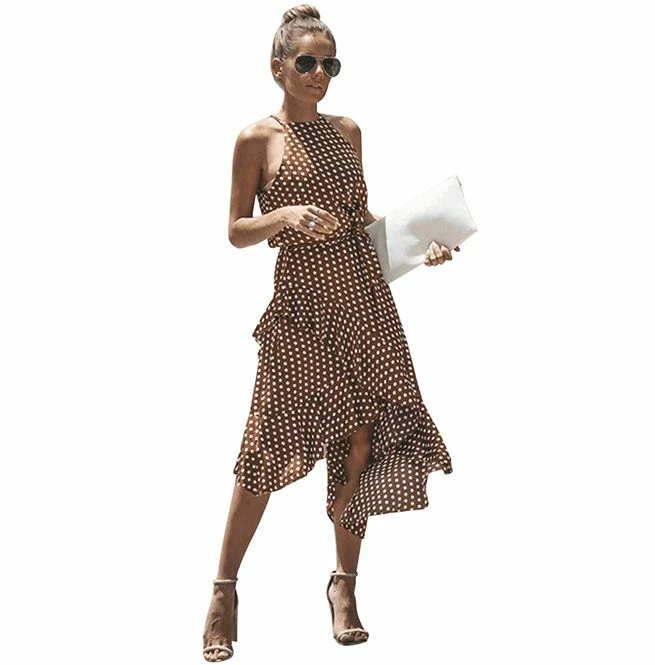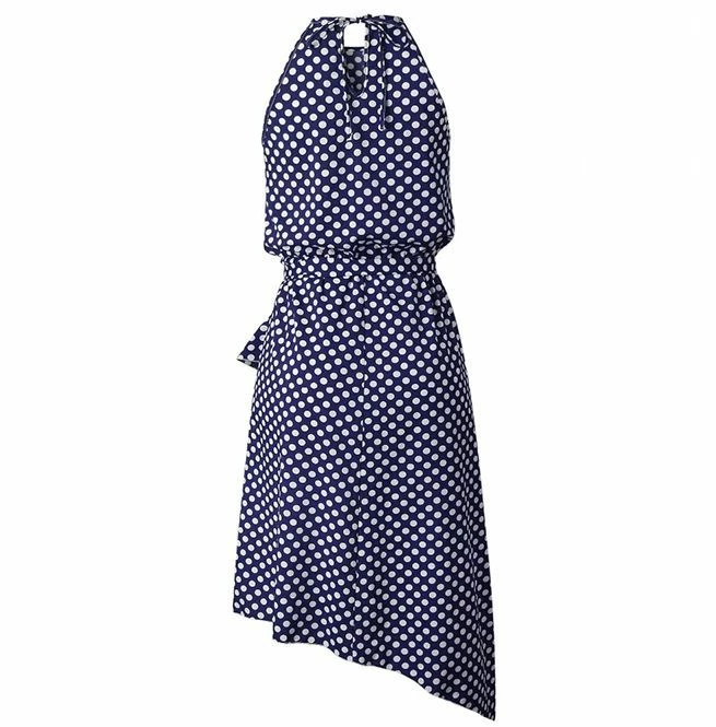 Update your summer wardrobe with this sleeveless polka dot midi dress. It is available in six sizes and three colors and is made of polyester material It features halter neck with an irregular hemline. The dress is ruffled and the dot print and the belt design makes it stand out. Pair with some heels for a day out with friends.