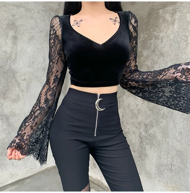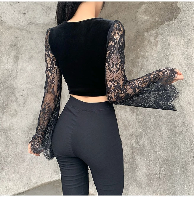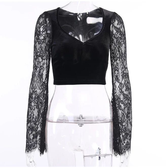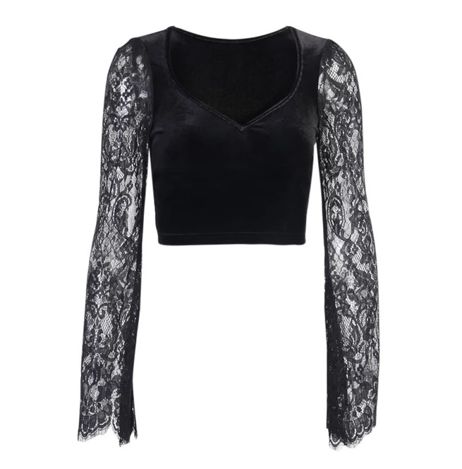 Black long flare sheer floral lace sleeves with a v neck. It is a slim fit and velvet.