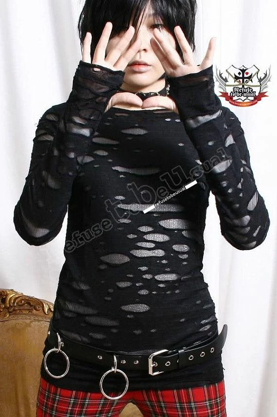 Refuse To Be Usual Standard Tops Punk Distressed Broken Mummy Corroded Raggedy Sheer Thumb Hole Mitten Shirt