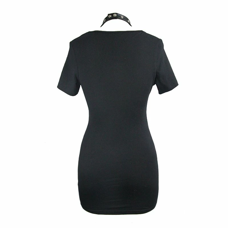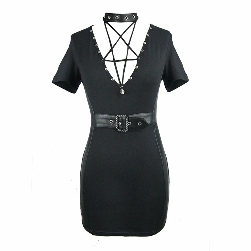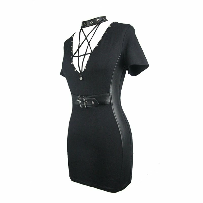 Show off your figure in this black bandage dress. It is made of quality 95% Cotton, 5% Spandex materials. It is a slim fit and fits above the knee. This black dress has short sleeves with a choker that extends to form a pentagram neckline with silver skull detail. The dress is studded along the neckline and features a buckle belt design for fitting. The sides of the dress are designed with a PU leather patchwork. Look sexy in this black Goth dress to parties or clubs.